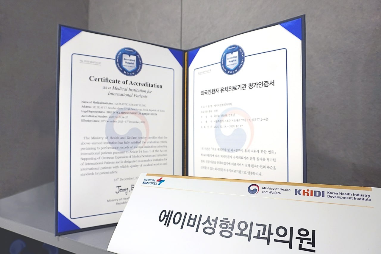AB整形外科荣幸地宣布,已正式通过由韩国保健福祉部、韩国保健产业振兴院(KHIDI)及医疗机构评估认证院(KOIHA)共同管理与监督的**“外国患者接待医疗机构认证”**。